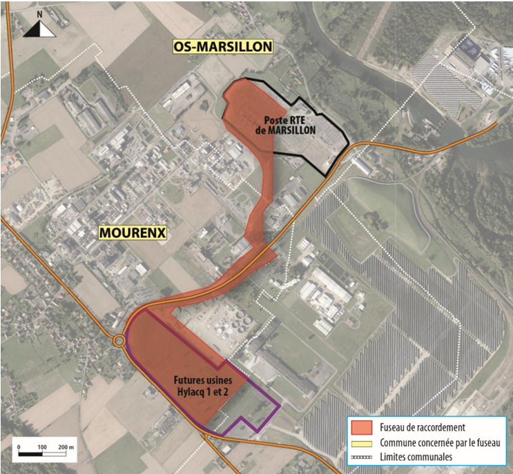 Les sites HyLacq et BioTJet/eM-Lacq seront raccordés au Réseau de Transport d'Électricité français (RTE) existant. Le site HyLacq sera alimenté directement par RTE et le site BioTJet/eM-Lacq sera alimenté depuis HyLacq. Deux liaisons souterraines à 400 000 volts, d'une longueur d’environ 2 kilomètres, relieront le poste client de HyLacq et le poste RTE de Os-Marsillon.